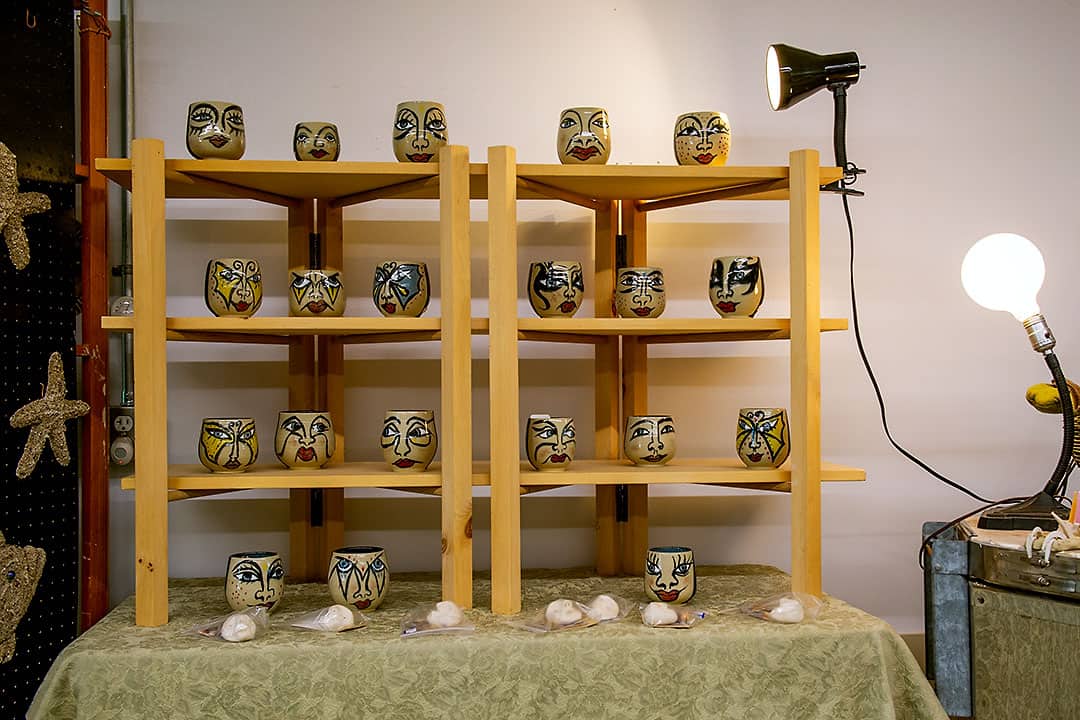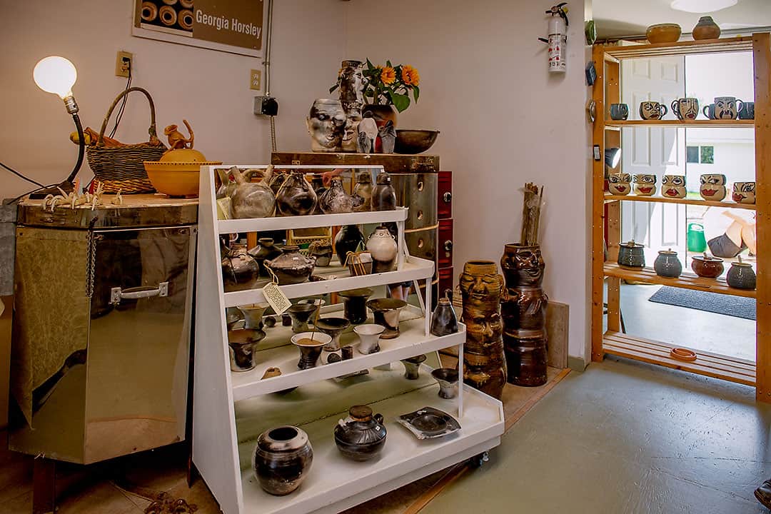 Happy at work in her studio in Elbow, Georgia Horsley incorporates both wheel thrown and hand built techniques, producing a variety of utilitarian vessels and sculptural yard decor. She likes to share her many years of creative enthusiasm for clay by offering workshops to the surrounding community.